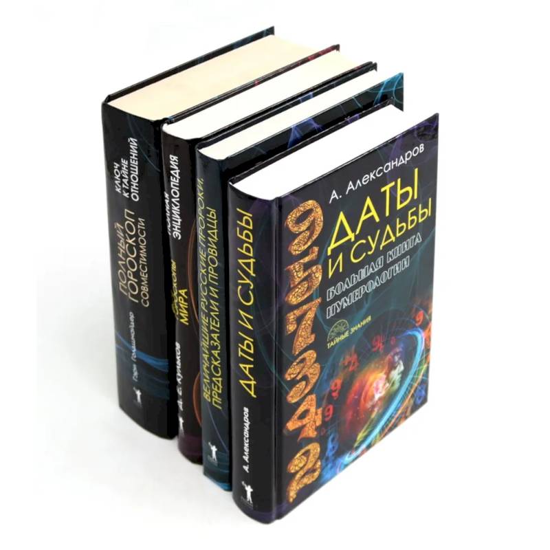 В комплект вошли четыре книги:  Александр Александров 'Даты и судьбы. Большая книга нумерологии. От нумерологии - к цифровому анализу'  Книга дает возможность использовать искусство нумерологии для прогнозирования любовных отношений. Простые и доступные приемы цифрового психоанализа помогут вам: выбрать наилучший путь для обретения своей 'второй половины'; избежать размолвок, ссор и скандалов; проверить вашего избранника на сексуальную совместимость; сделать вашу интимную жизнь, как никогда, насыщенной, яркой и гармоничной; устранить все преграды на пути к идеальному любовному союзу. Читатель получает возможность овладеть тайнами древнейшей науки нумерологии. Отныне вам будут понятны причины хитросплетения судеб, подвластно предсказание не только устойчивости семьи, взаимоотношений между родителями и детьми, сослуживцами и родственниками, но и многих политических явлений. И все это благодаря огромной информации - ее несет в себе дата рождения человека или дата какого-либо события.  'Величайшие русские пророки, предсказатели и провидцы'  На Руси и в царской России было много провидцев, предсказателей и прорицателей. У каждого из провидцев-святителей своя непростая судьба, свой трудный и благородный жизненный путь. В этой книге собраны истории и рассказы о русских святых, провидцах, праведниках и святителях; о монахе Авеле Вещем, проведшем более двадцати лет за свои пророчества в тюрьмах и крепостях, о российских юродивых и блаженных, о гадалках и медиумах, а также о многих других людях, оставивших яркий след в русской истории. Российские прорицатели и провидцы, их предсказания исторического будущего в ушедшем прошлом России являются частью нашей истории, которую мы должны знать.  Дмитрий Кульков 'Все гороскопы мира. Полная энциклопедия'  Все народы мира на всем протяжении истории человеческой цивилизации уделяли особое внимание составлению гороскопов и относились к этому очень серьезно. В связи с разными климатическими и культурными особенностями той или иной человеческой общности, гороскопы были соотнесены не только со звездным кругом Зодиака, но и с животными, растениями, камнями и фантастическими существами.  Читатель сможет не только пополнить свои знания о классических гороскопах, но и познакомиться как с наиболее архаическими календарными раскладами, так и с разработками новейшего времени.  Гэри Голдшнайдер 'Полный гороскоп совместимости. Ключ к тайне отношений'  Перед вами мировой бестселлер, расширяющий знаменитую астропсихологическую систему Гэри Голдшнайдера. Эта книга - ключ к познанию себя и своих близких, к взаимопониманию с любимыми, родными, друзьями и коллегами по работе. С ней вы станете настоящим знатоком человеческих характеров, научитесь читать скрытые намерения других людей, прогнозировать успешность различных знакомств, деловых контактов и любовных союзов. Звезды помогут вам установить гармоничные и доверительные отношения в семье, обрести надежных и преданных друзей, верного и любящего спутника жизни - одним словом, сделать решительный шаг навстречу своей счастливой судьбе.