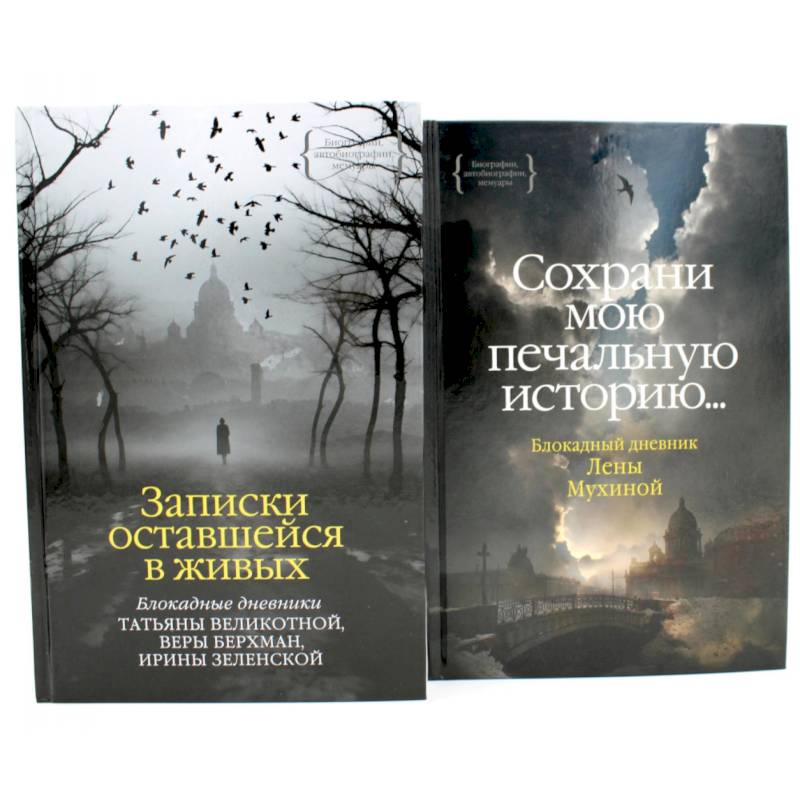 Комплект состоит из двух книг: «Записки оставшейся в живых. Блокадные дневники Татьяны Великотной, Веры Берхман, Ирины Зеленской» и «Сохрани мою печальную историю... Блокадный дневник Лены Мухиной». О книге «Записки оставшейся в живых. Блокадные дневники Татьяны Великотной, Веры Берхман, Ирины Зеленской»: На сегодняшний день известно несколько сотен дневников жителей осажденного Ленинграда. Но, несмотря на общность времени, места и чудовищных обстоятельств, породивших этот уникальный коллективный текст блокадного города, каждый из них поражает нас особо. За строками каждого - история столкновения личности с катастрофой исторического масштаба, катастрофой, растянувшейся на годы и подробно зафиксированной очевидцами в реальном времени. «Страницы воспоминаний, писем, документов напоминают порой страницы Апокалипсиса, создают образ города как всепоглощающей могилы, в ненасытной утробе которой исчезли сотни тысяч детей, женщин, мужчин...» Тем более поразительными и поистине жизнеутверждающими оказываются те дневниковые записи, за которыми, вопреки ужасу блокадной повседневности, отчетливо видна несломленная цельная личность. Таковы публикуемые в этой книге дневники Ирины Дмитриевны Зеленской и сестер Веры Константиновны Берхман и Татьяны Константиновны Великотной. Личные дневники - особый вид литературы: за отдельными исключениями, сторонний читатель оказывается допущен к этим текстам случайно. Но ценность блокадных дневников уникальна и непреходяща: в те страшные дни они служили отдушиной своим авторам, в наши дни - дарят невымышленные примеры жизненной стойкости, утверждая в мысли, что даже в нечеловеческих условиях возможно оставаться человеком. О книге «Сохрани мою печальную историю... Блокадный дневник Лены Мухиной»: Ленинградская школьница Лена Мухина начала вести дневник в мае 1941 года, не предполагая, что совсем скоро записям в этом небольшом блокноте суждено будет превратиться из хроники юношеской влюбленности в хронику одной из самых страшных катастроф в истории человечества и стать частью драматичного коллективного текста под названием «блокадные дневники». Что можно противопоставить мучительному умиранию от голода в условиях, когда рушатся общепринятые нормы морали? Что может спасти от духовной деградации в условиях, когда борьба за выживание лишает «человеческого лица», а голод и страх смерти превращают человека в животное? Одним из средств спасения оказалась упорядоченность букв. Попытка через слово осмыслить происходящее, понять себя. И еще: интуитивное знание, что нужно сохранить свою историю, свой опыт - для других. Сегодня, когда расшифровывается и публикуется все больше блокадных дневников, мы понимаем, насколько велика непреходящая ценность этих документальных свидетельств трагической эпохи. Подобно дневнику Анны Франк, дневник Лены Мухиной по праву можно причислить к ряду самых драматичных и самых пронзительных произведений XX века.