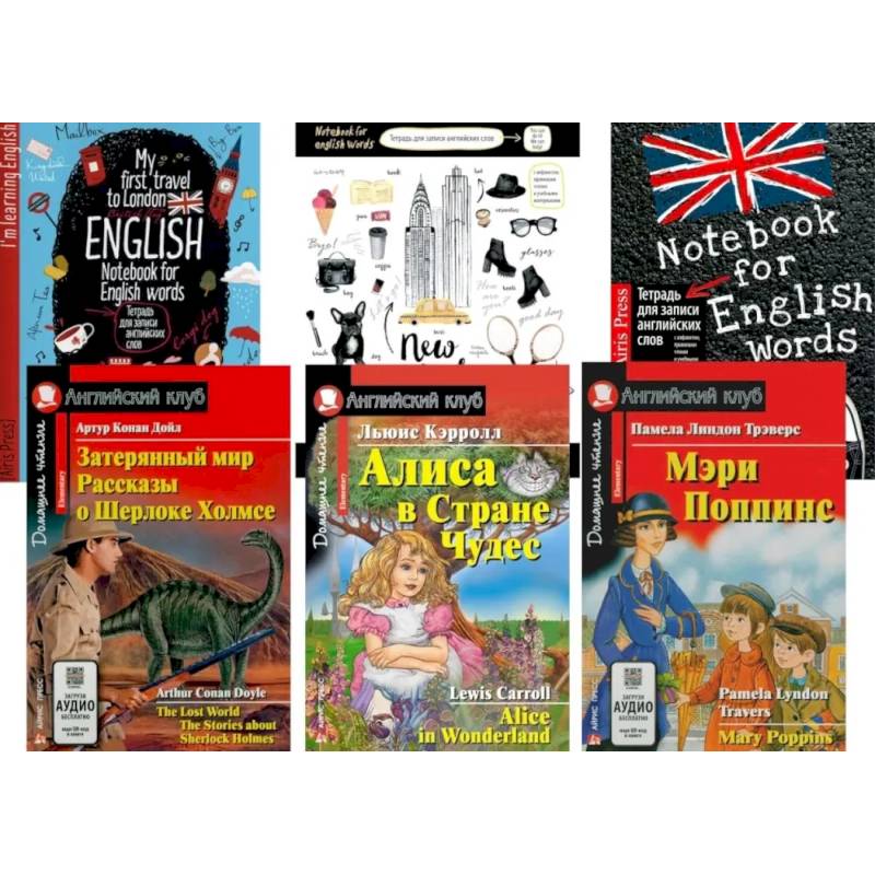 Комплект состоит из трех тетрадей для записи английских слов и трех книг уровня Elementary на английском языке:
