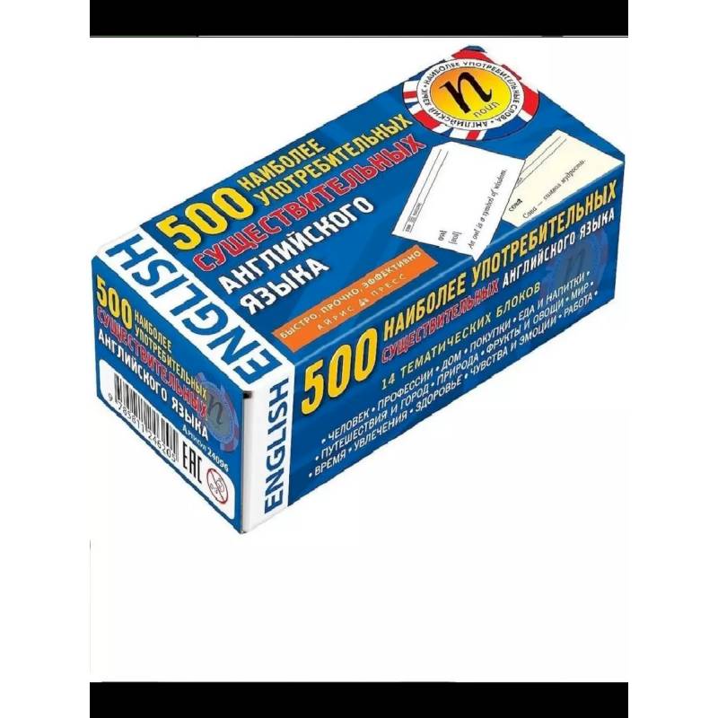 Существительные разделены на 14 тематических блоков и имеют сквозную нумерацию.Учить слова на карточках можно в транспорте, на пляже — везде, где есть свободная минутка и желание пополнить собственный словарный запас.С помощью этих карточек вы быстро овладеете наиболее употребимыми английскими существительными. Перед тем как отправиться в ресторан, в отель, за покупками, пролистайте карточки по интересующей вам теме, и вы почувствуете себя намного увереннее. Мы рекомендуем учить слова двумя способами. Сначала посмотрите на английскую сторону карточки, прочитайте слово и попытайтесь вспомнить его значение. Если вспомнить перевод не удаётся, обратитесь к примеру употребления или посмотрите на обратную сторону карточки и отложите её в стопочку для повторения. Когда вы сможете вспомнить перевод каждого существительного, переверните стопку карточек и попробуйте перевести русские существительные на английский язык.