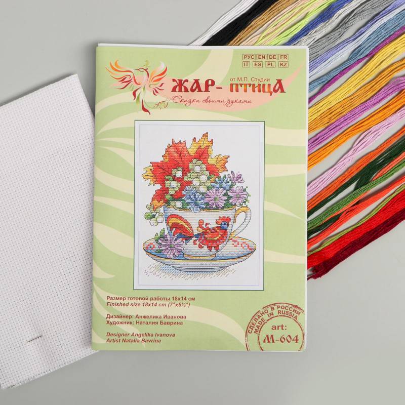 В набор входит: канва Аида №14, нитки мулине 25 цветов, игла, схема и руководство по вышиванию.