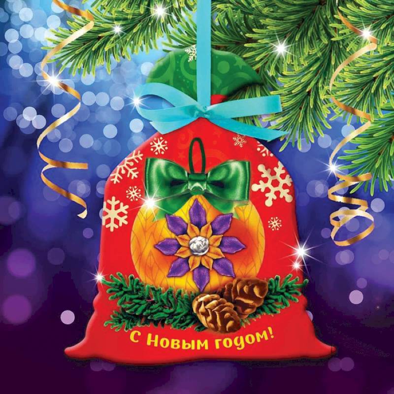 —Новогодняя вышивка лентами на мешочке 'Елочный шар', основа 25x35 см